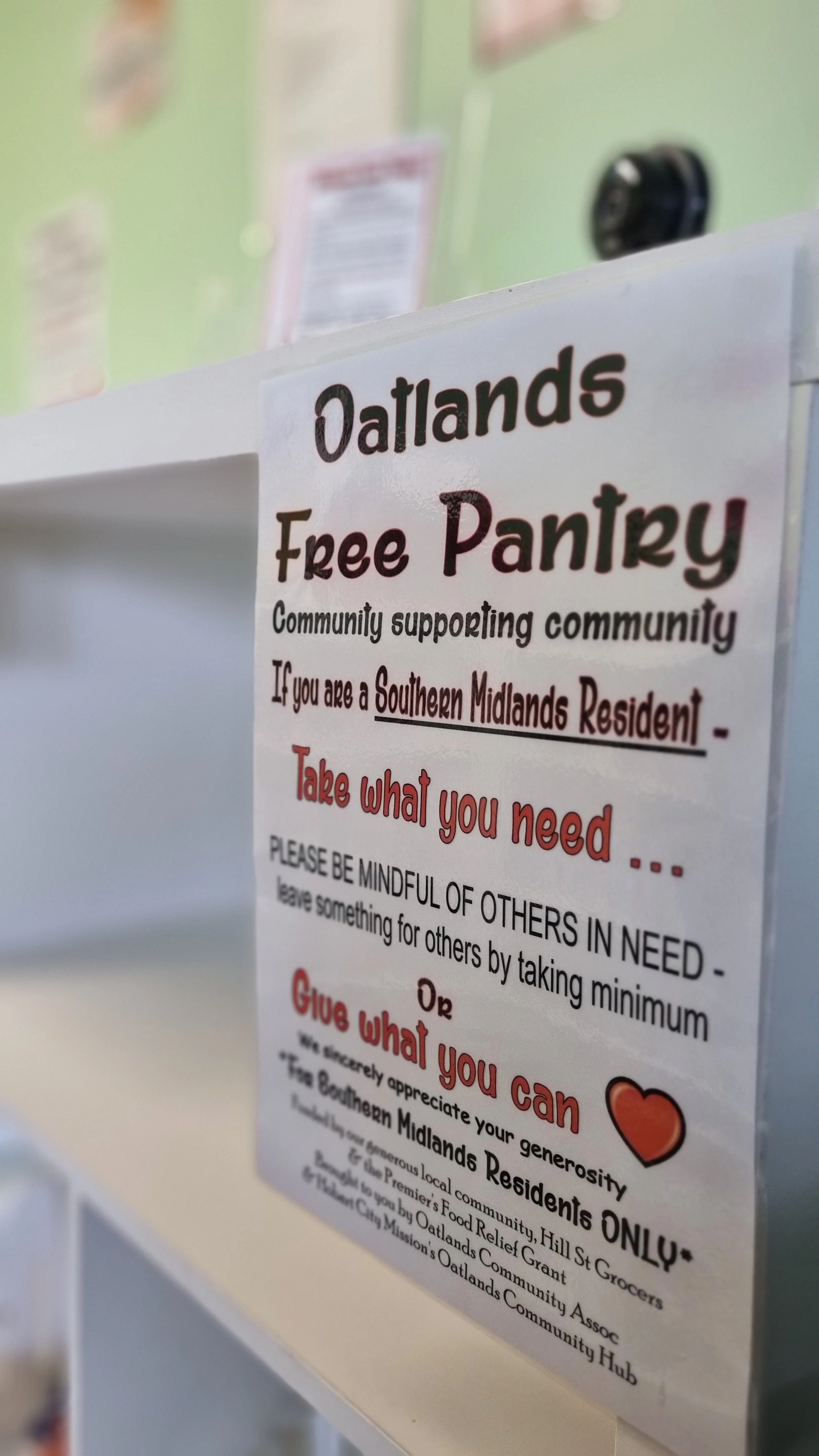 Started in 2023 with funding from the Tasmanian Department of Premier and Cabinet, the Oatlands Free Pantry marks a dramatic change in the way food relief is delivered to the community. We have moved away from the Hobart City Mission’s Oatlands Community Hub formal emergency relief delivery model, as it had become clear that we still weren’t reaching all the vulnerable community members in need of food assistance.