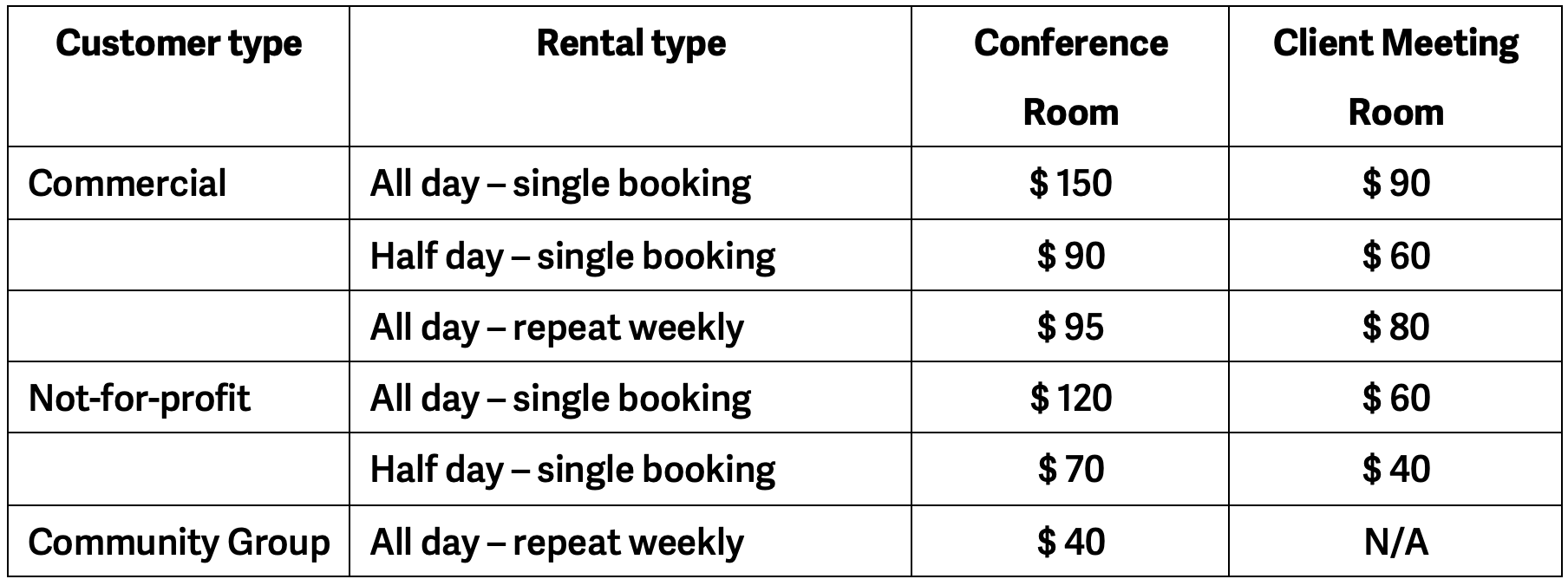 Our building hours are 10:00 am to 4:00 pm. Room hire includes complimentary tea and coffee, wi-fi, whiteboard, and in the Main Conference Room, a wide screen TV that can be hooked up to a laptop. There is a small kitchen with stove, microwave, and refrigerator.